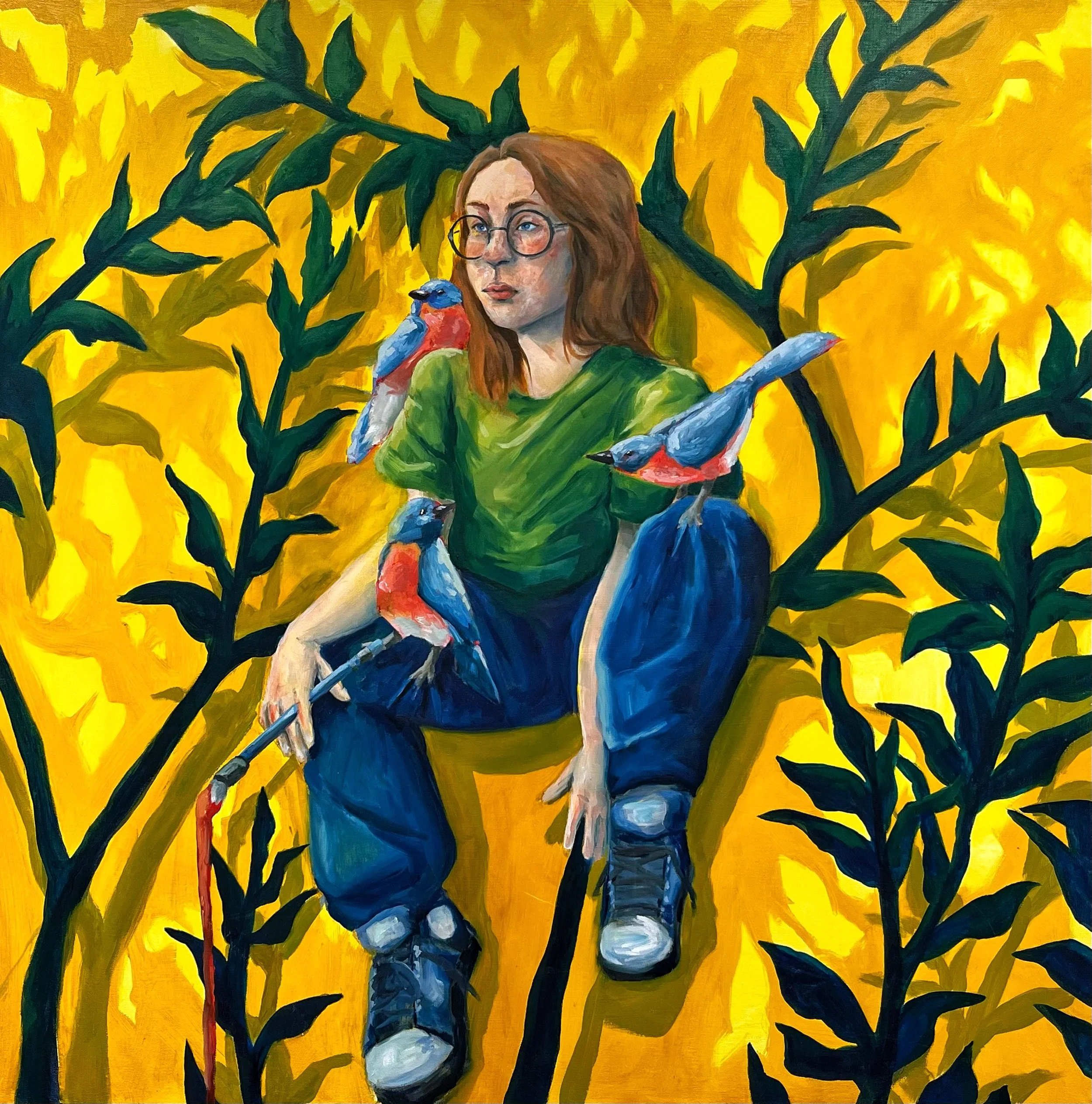 Through this piece I explore my relationship with those who have guided me through my life. Placing my figure among three birds, each representing individuals close to me, I convey a sense of peace and recollection.
